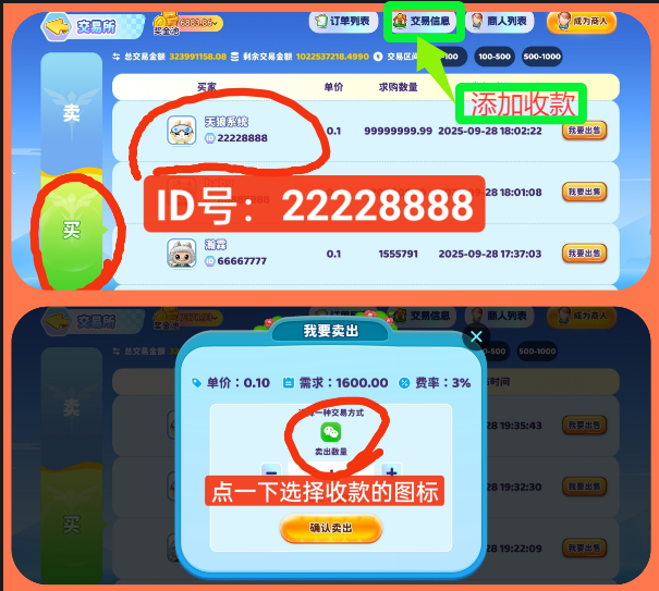 2、交易大厅出售10的整倍数,出售收到款后记得确认收货,提高成交效率;