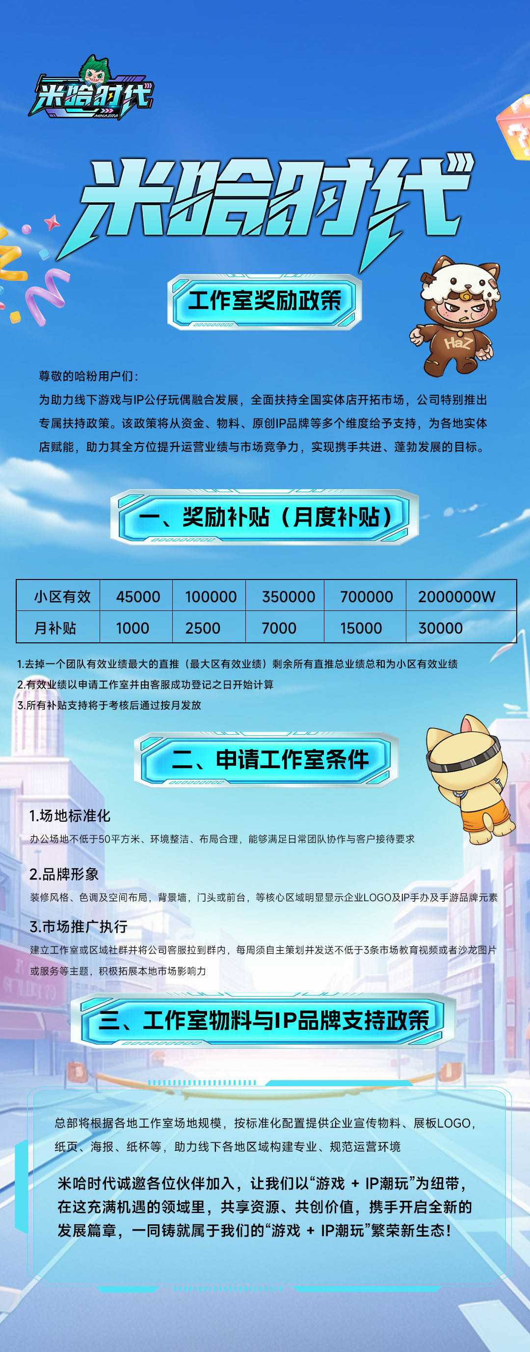 米哈时代为促进线下游戏与IP潮玩产业的深度融合,现正式推出专项工作室扶持政策!我们致力于通过全方位、多角度的支持体系,助力全国实体店开拓市场,提升运营竞争力,实现共赢发展。