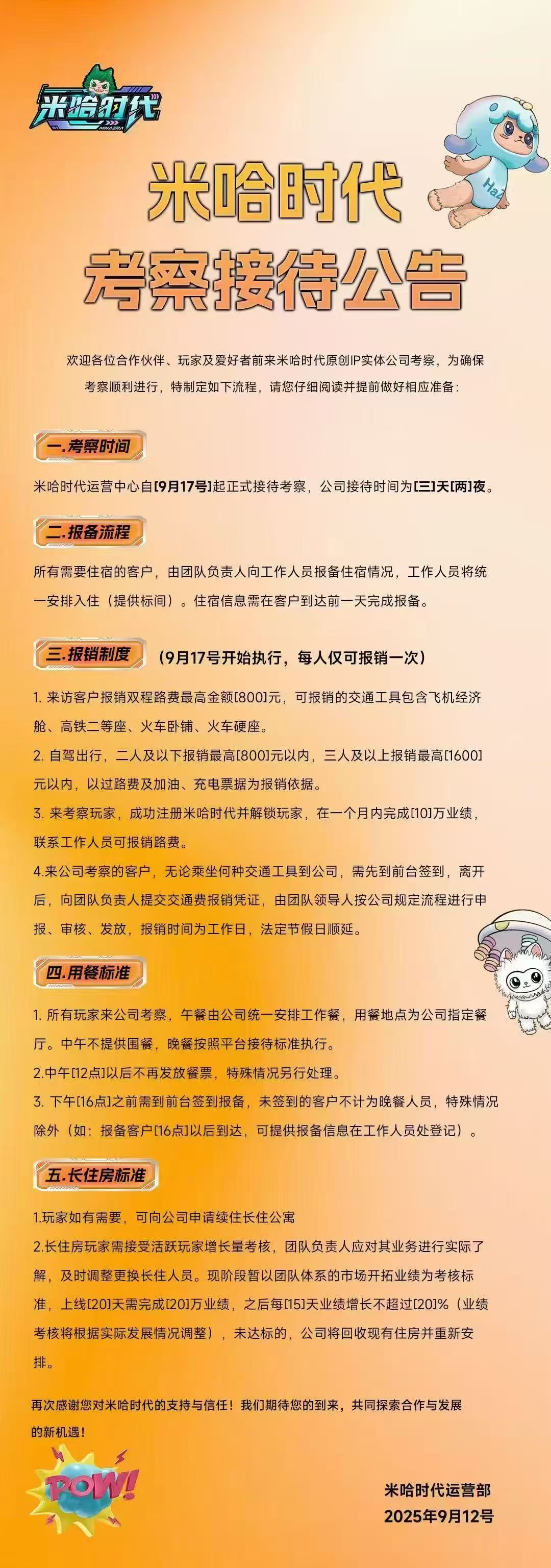 米哈时代运营中心诚挚邀请您前来我们的原创IP实体公司进行实地考察!为促进更深层次的了解与合作,我们特别制定了完善的接待政策,期待您的莅临。